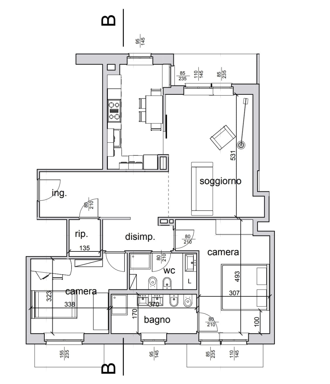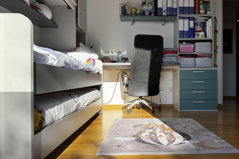 La soluzione si compone di ingresso, cucina, soggiorno, due camere da letto, due bagni di cui uno con accesso diretto dalla camera padronale, ampio ripostiglio e tre balconi.